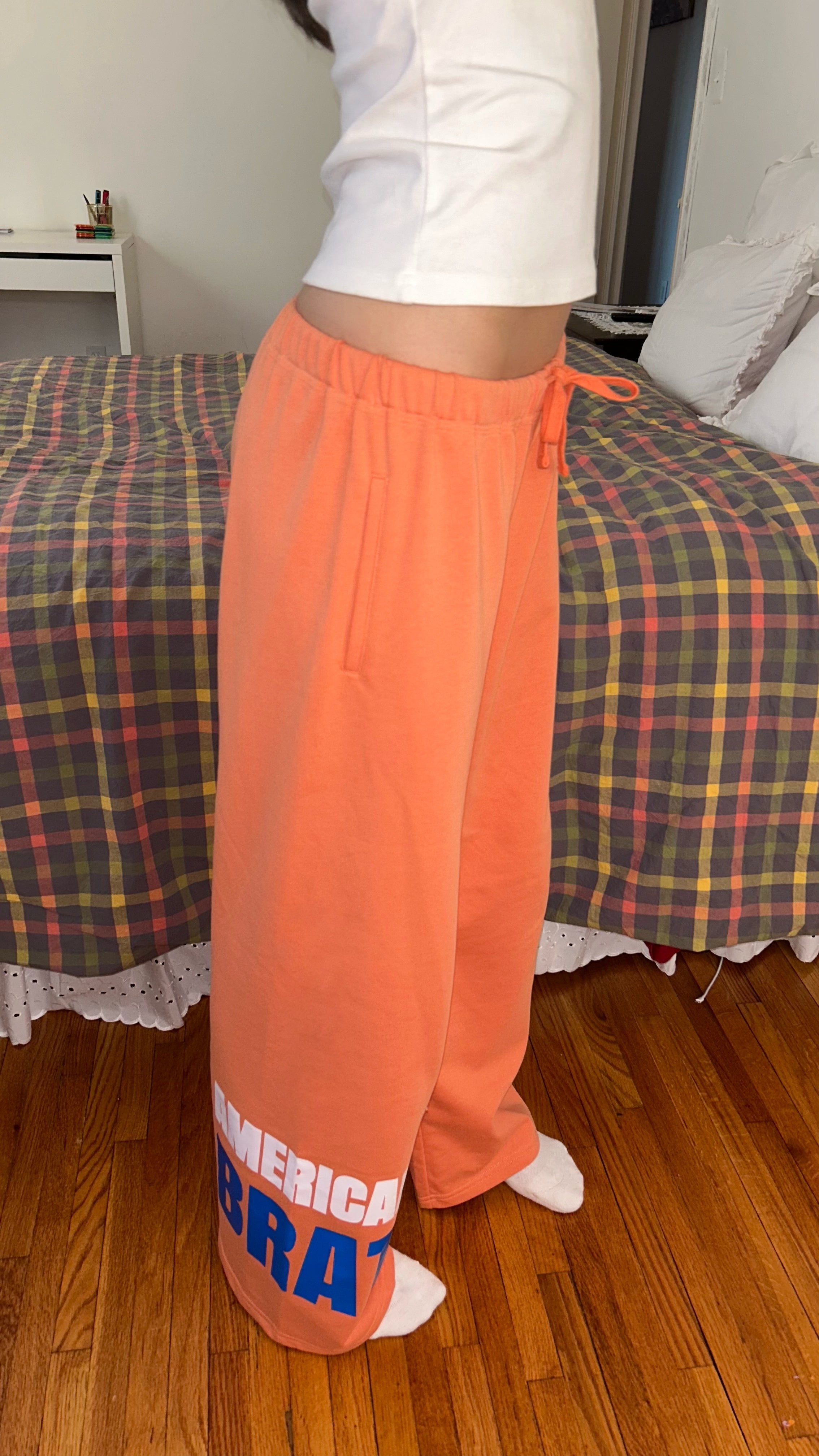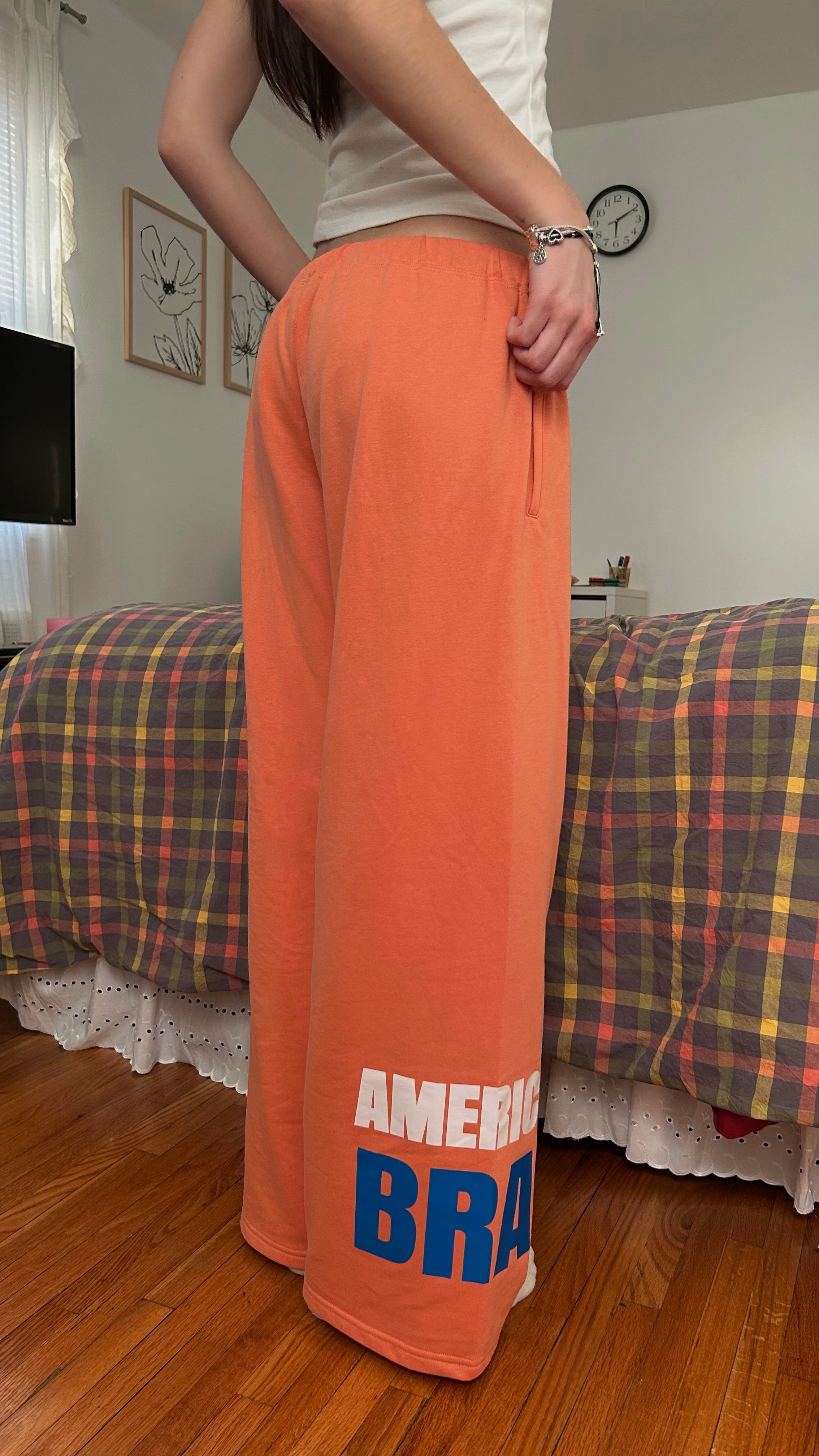 The American Brat true low rise sweatpants! Featuring an embroidered American Brat skull logo on the right thigh and ‘American Brat’ pressed graphic design on the left leg. Made with ultra soft fabric with two pockets and an adjustable drawstring waist.