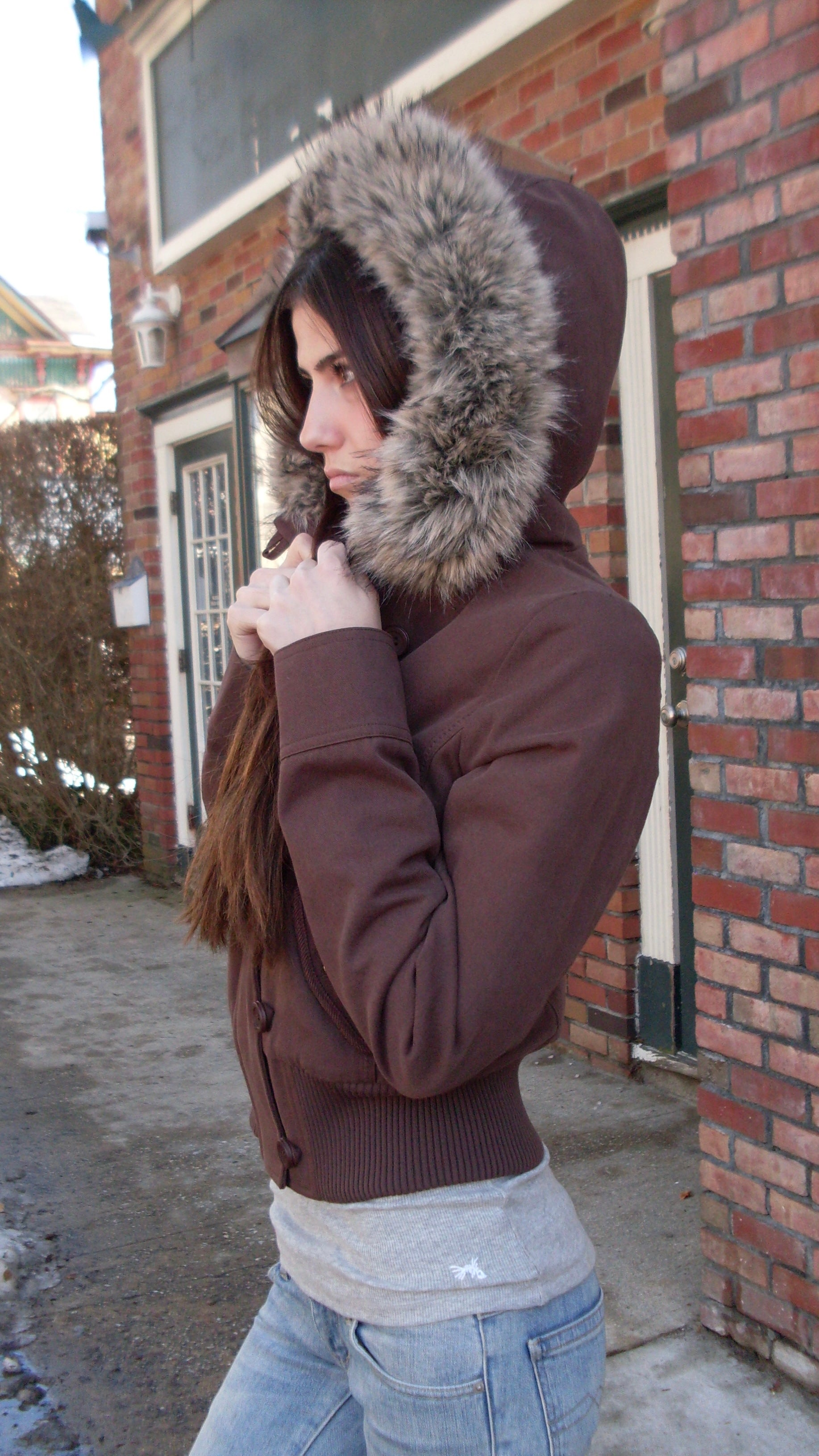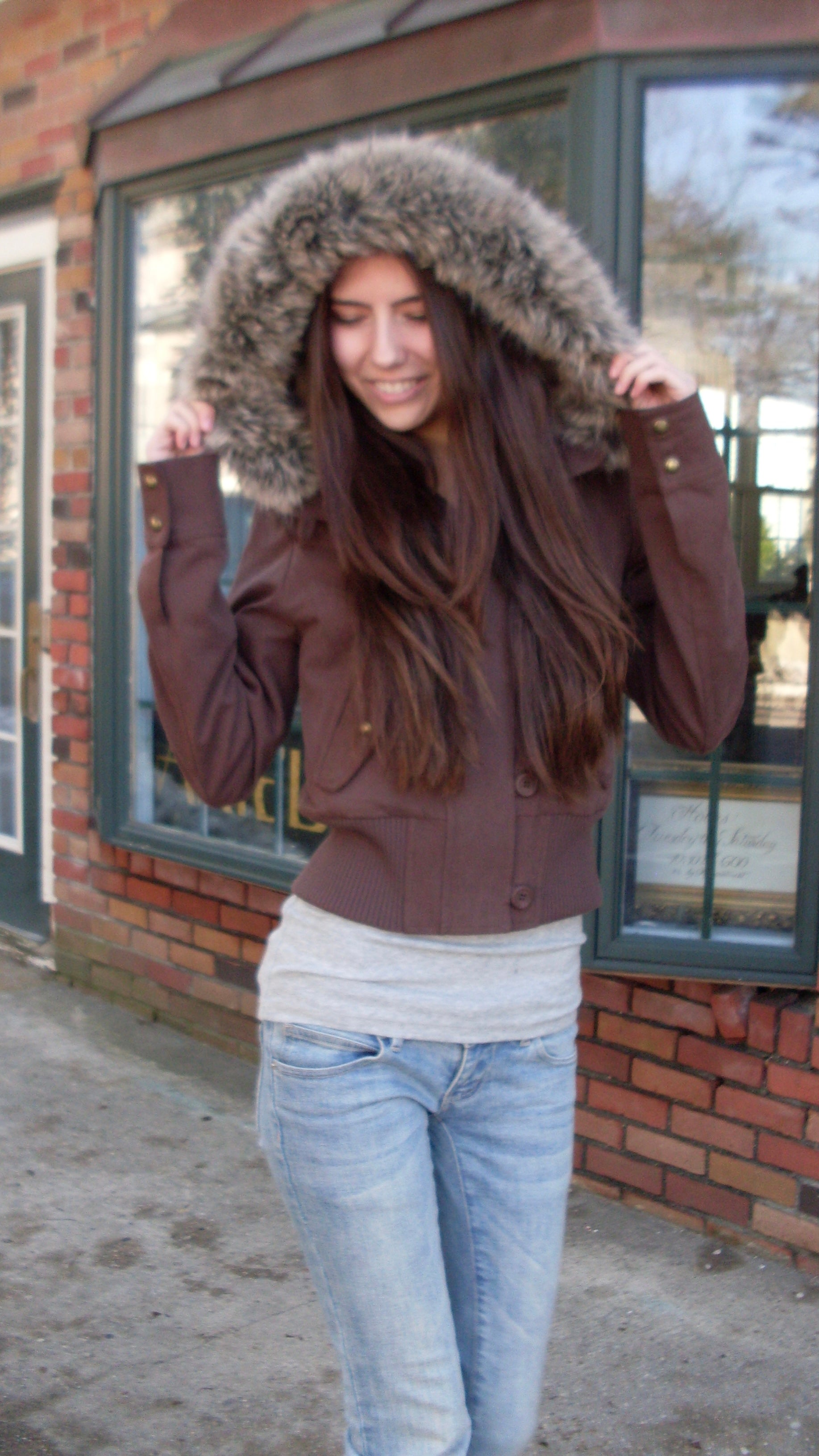 The cutest brown jacket with fur lining on the inside for extra warmth. This jacket features a fur trimmed hood, two front pockets, and six buttons in the front. The fur is completely removable to you can wear it how you'd like. It has a slightly cropped fit with a thick waistband that cinches at the waist for a super flattering shape.